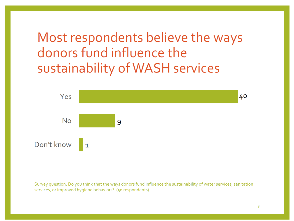 - Most respondents believe the ways donors fund influence sustainability of water, sanitation and hygiene interventions.